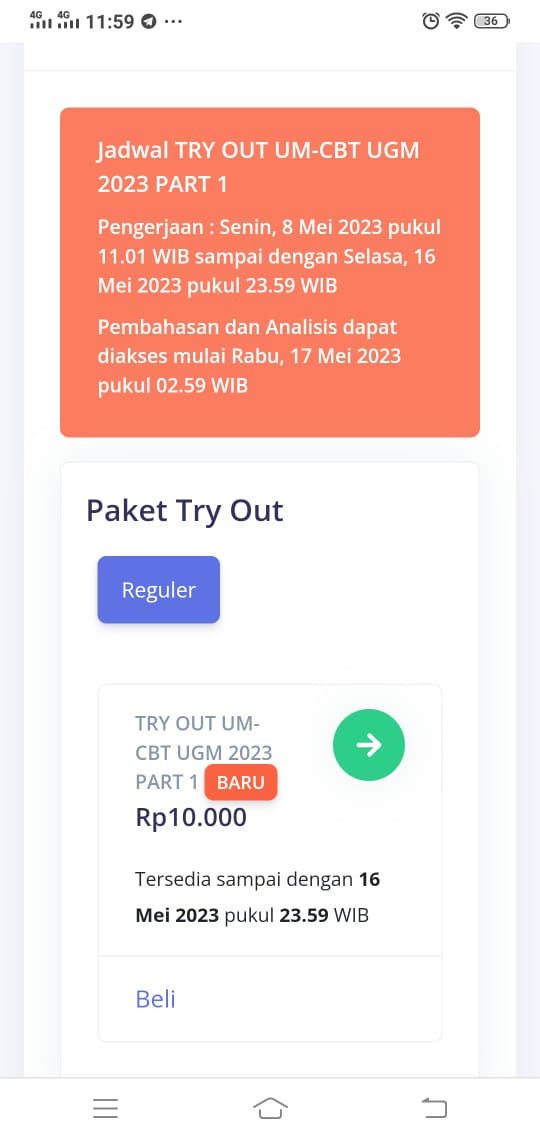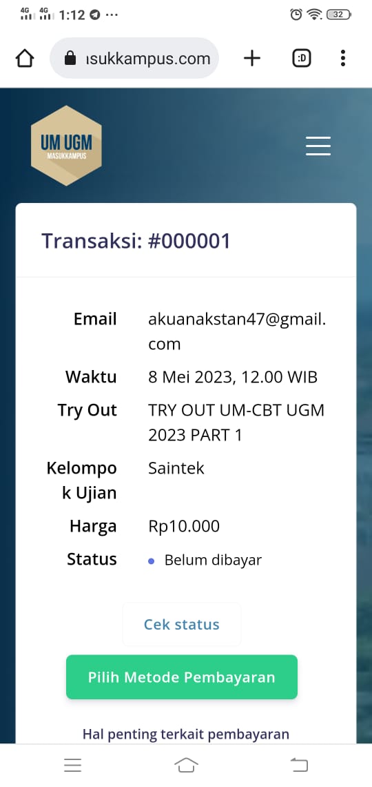 Tunggu beberapa saat, pembayaran kamu akan terkonfirmasi otomatis dan kamu bisa mengerjakan TO online UM-CBT UGM Masuk Kampus